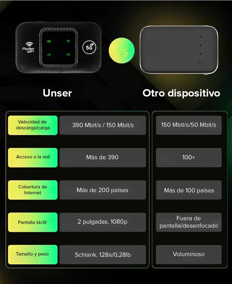 Desde el momento en que lo encendí, supe que había hecho una buena elección. La conexión es increíblemente rápida y nunca he tenido problemas de señal. Me encanta la duración de la batería, que me permite usarlo todo el día sin necesidad de recargarlo. La compatibilidad con diferentes redes es perfecta para mis viajes internacionales. El servicio al cliente fue muy eficiente y resolvieron mis preguntas en poco tiempo.
